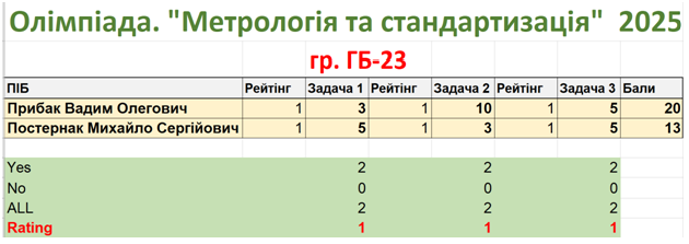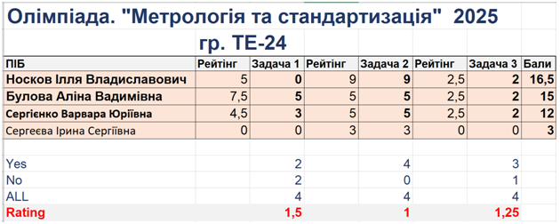 Журі олімпіади у складі доцентів Копаниці Ю.Д. і Гіжі О.О. щиро вітають переможців олімпіади та бажають всім подальших успіхів у навчанні!. Сподіваємось, що започаткована у 2024 році олімпіада з “Метрології та стандартизації” отримає статус щорічної. Сама олімпіада розширить свою географію в межах факультету серед студентів спеціальностей 192, 194, 144 тощо.