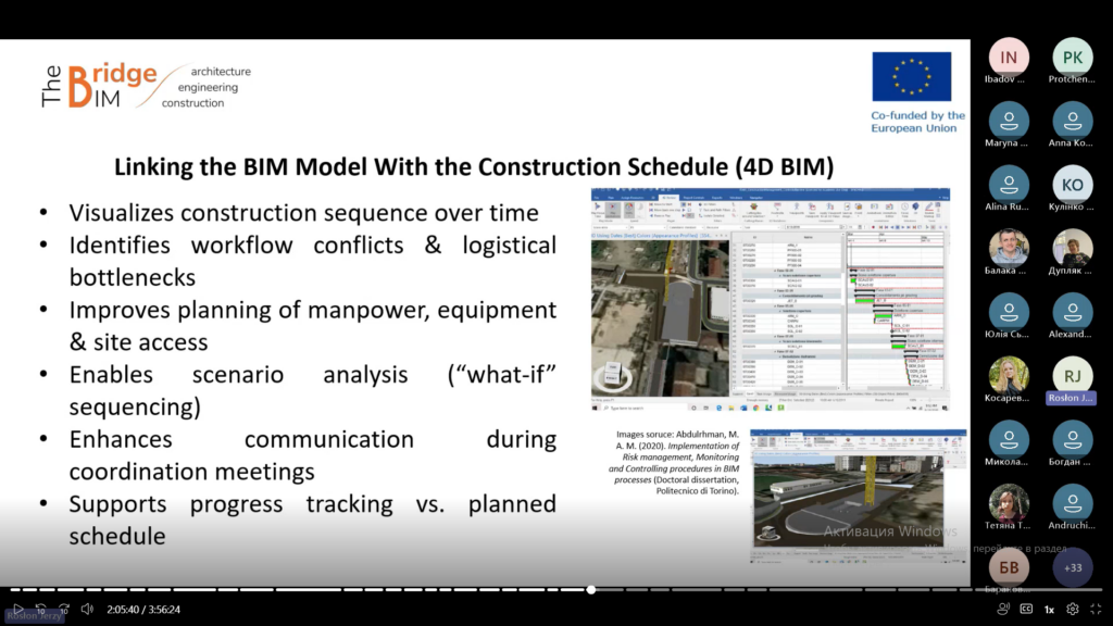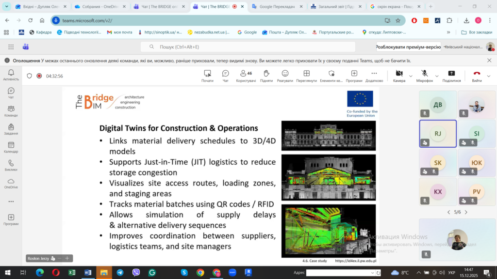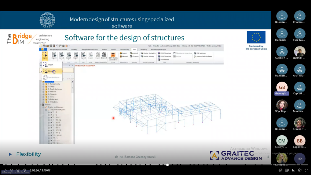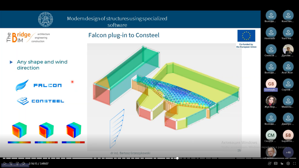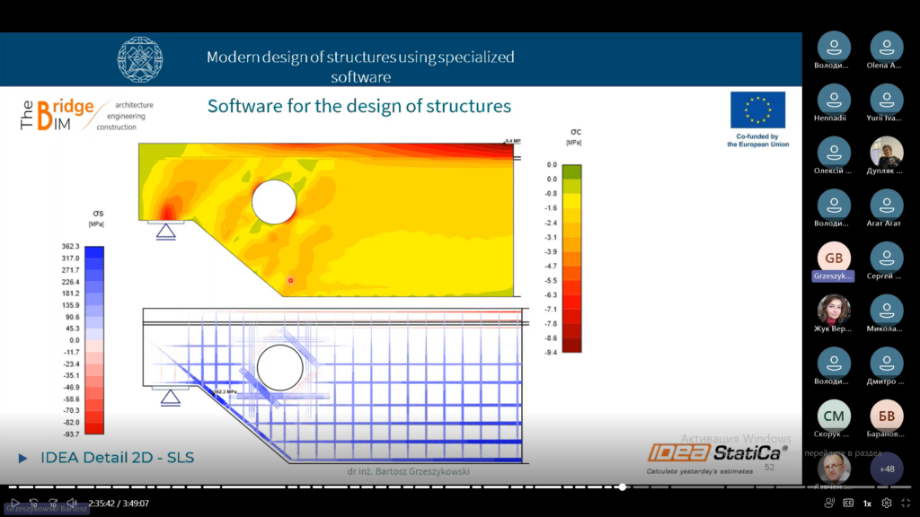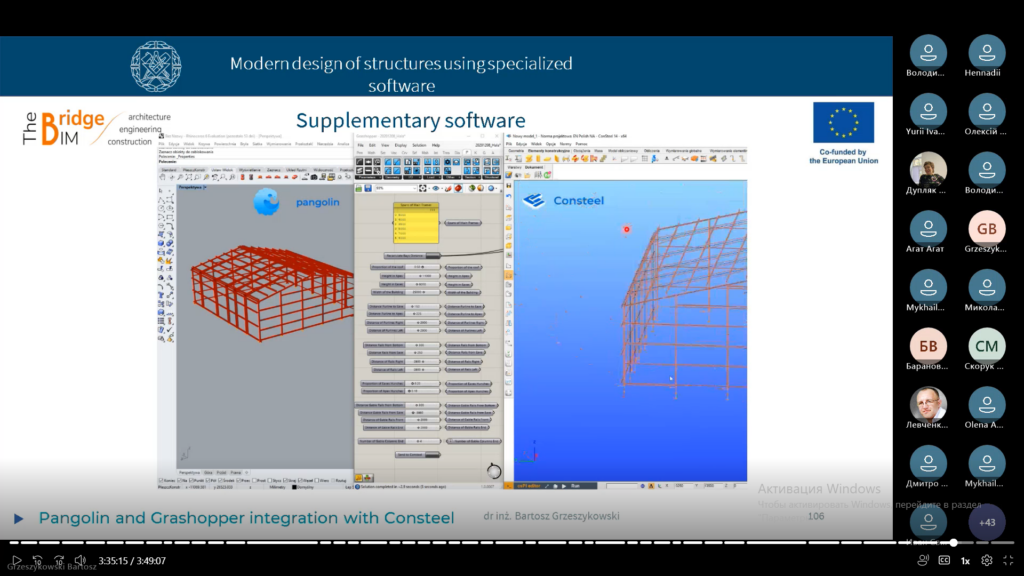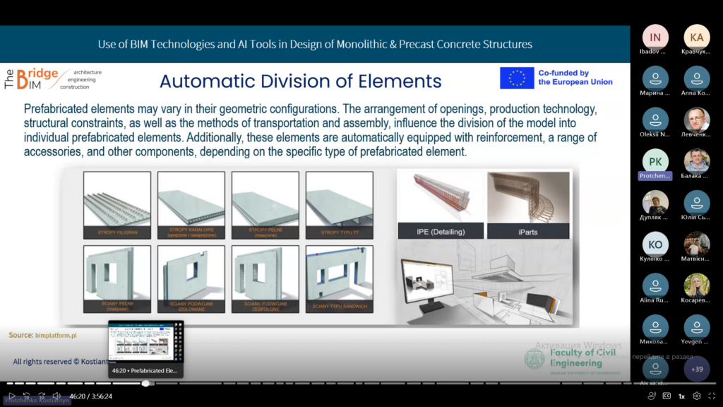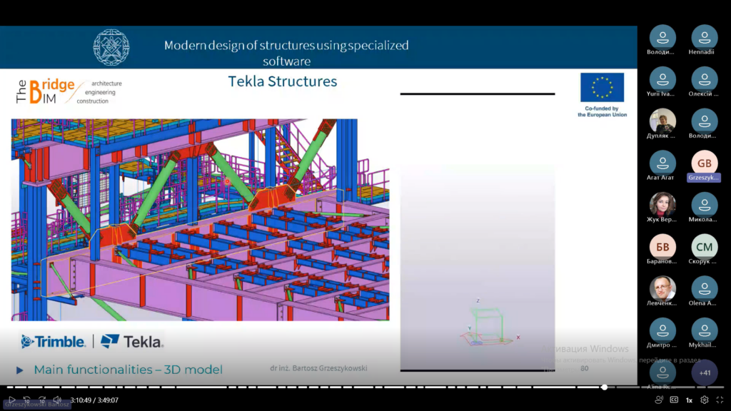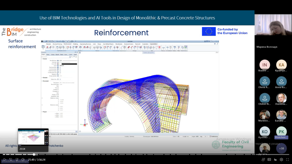 11 та 15 грудня в рамках проєкту The BRIDGE, що спів фінансується ЄС, відбулися перші із загального циклу онлайн майстер класи з будівельно-інформаційного моделювання від наших європейських партнерів з Польщі, Німеччини, Словаччини та Італії. Їх провели викладачі Варшавського технічного університету (WUT). Організатором виступив Київський національний університет будівництва і архітектури. Тематикою заходів були “Вибрані питання процесів виробництва збірного залізобетону”, “Сучасне проєктування конструкцій з використанням спеціалізованого програмного забезпечення”, “Використання BIM-технологій та інструментів штучного інтелекту в проєктуванні монолітних та збірних залізобетонних конструкцій”, “BIM-технології для планування та нагляду за будівельними роботами”. Спікерами виступили викладачі WUT: Олександр Нікал, Бартош Гжешиковський, Костянтин Протченко, Єжи Рослон. До них доєднався доцент КНУБА Олег Фесенко з темою “Вогнестійкість залізобетонних конструкцій із застосуванням будівельно інформаційного моделювання”. Учасники із зацікавленістю ознайомилися з можливостями сучасного програмного забезпечення для будівельно-інформаційного моделювання, отримали нові знання для розвитку своїх практичних навичок.