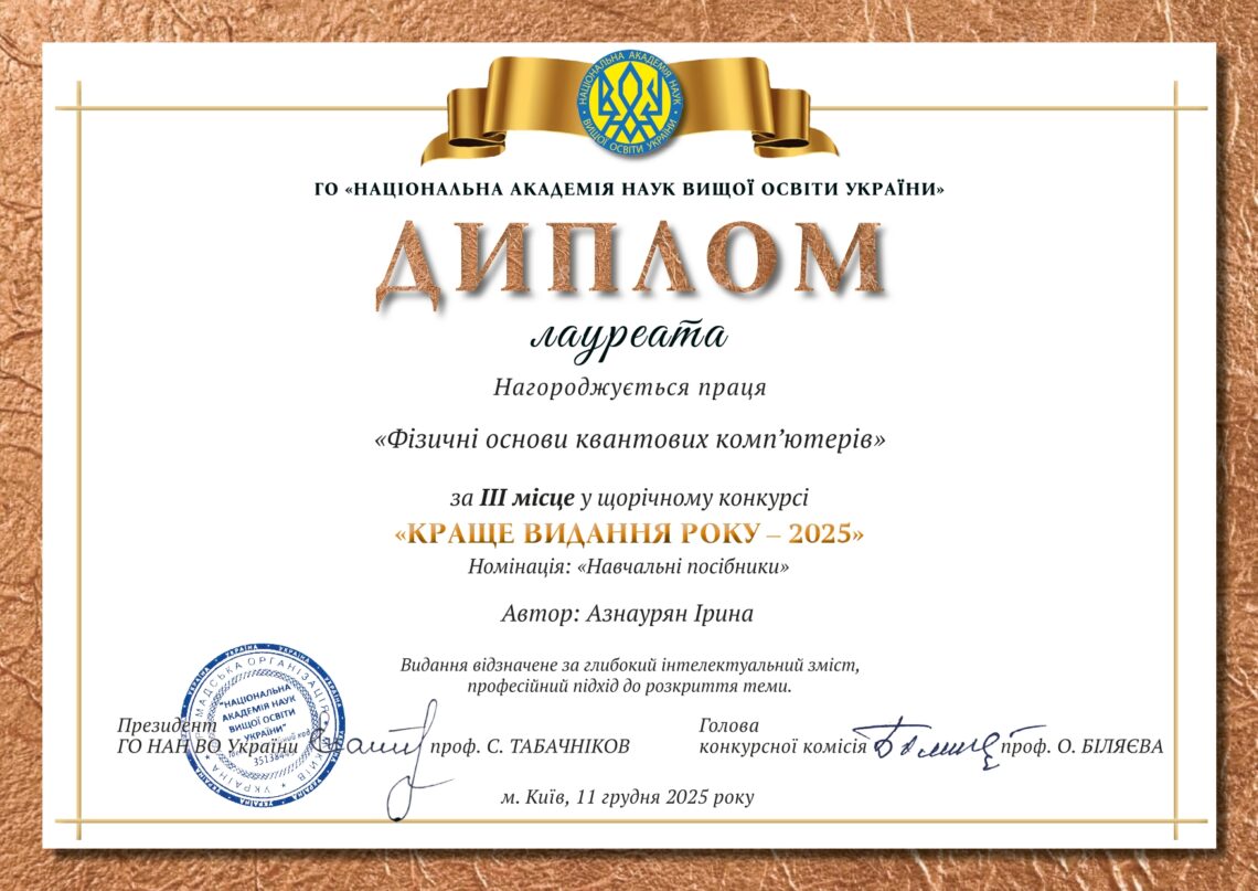 Викладачка кафедри фізики Ірина АЗНАУРЯН стала призеркою щорічного конкурсу «Краще видання 2025 року», який проводить громадська організація «Національна академія наук вищої освіти України».
