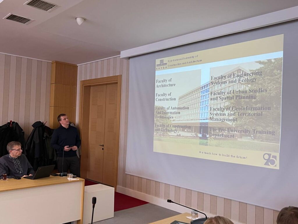 КНУБА на координаційній зустрічі представляли співробітники факультету інженерних систем та екології: доцент кафедри водопостачання та водовідведення Олександр Кравчук та асистент кафедри теплотехніки Євген Кулінко. Учасники зустрічі презентували свої університети, їх досягнення в галузі екологічного енергоефективного будівництва. На зустрічі обговорювалися задачі проєкту, терміни їх виконання і зони відповідальності кожного партнера.