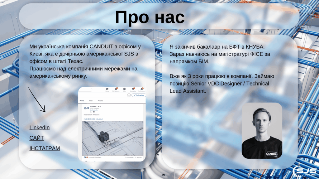 17 березня відбулася презентація курсу BIM&VDC для студентів КНУБА. Владислав Самойлов магістр ОНП «Будівельно-архітектурне інформаційне моделювання, ВІМ процесний менеджмент» виступив спікером від імені української компанії CANDUIT, яка є дочірньою американської SJS з офісом в штаті Техас і активно працює над електричними мережами на американському ринку. Він розказав про проєкти, які реалізує його компанія, важливість будівельно-інформаційного моделювання для реалізації будівельних проєктів, програму на якій навчається та пояснив для чого потрібний План реалізації ВІМ проєкту.