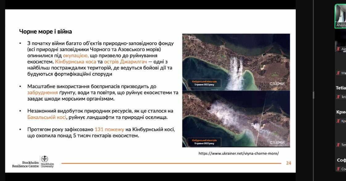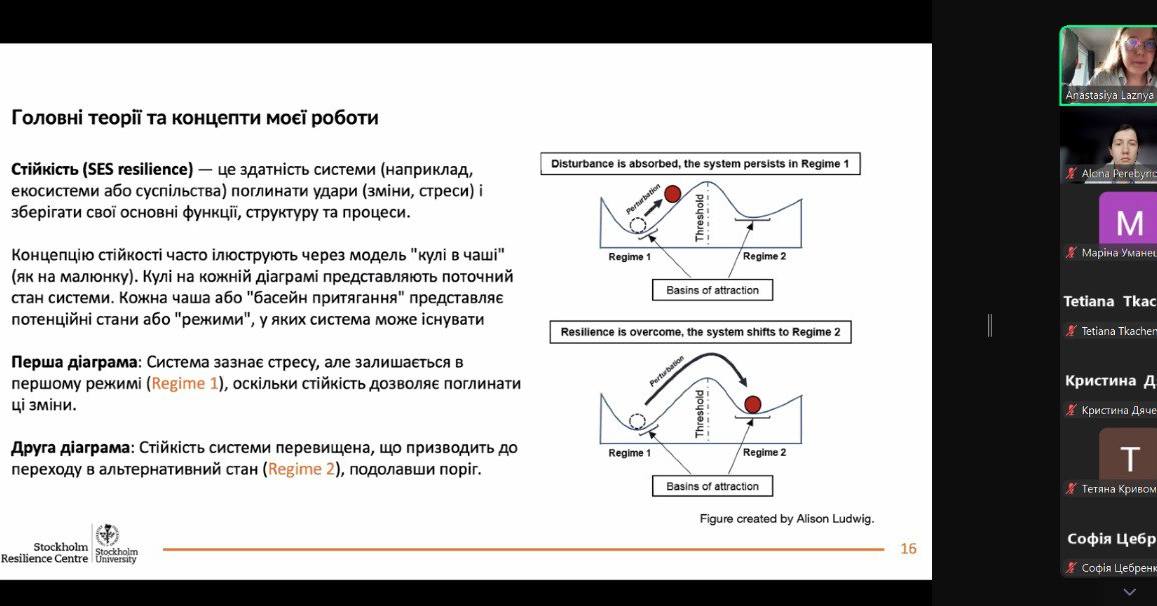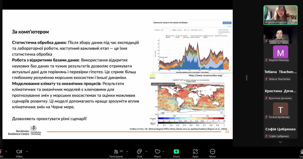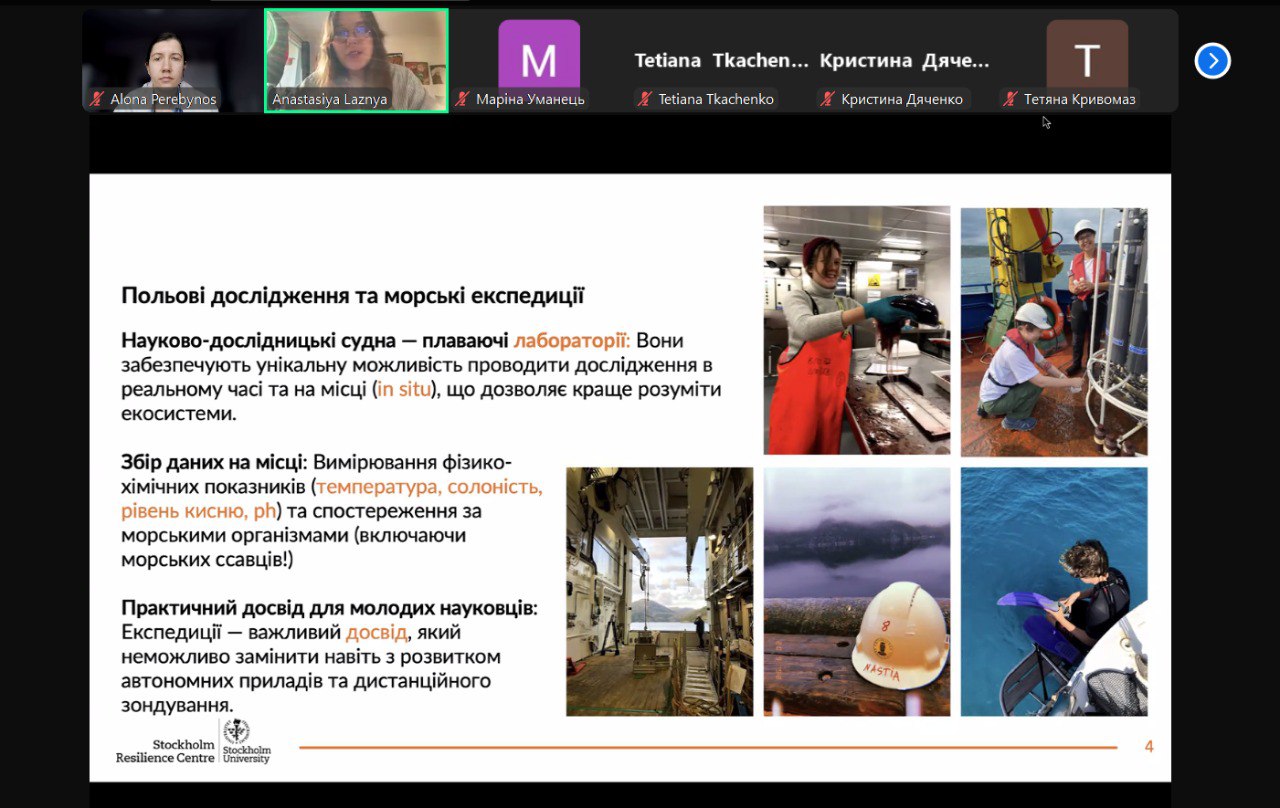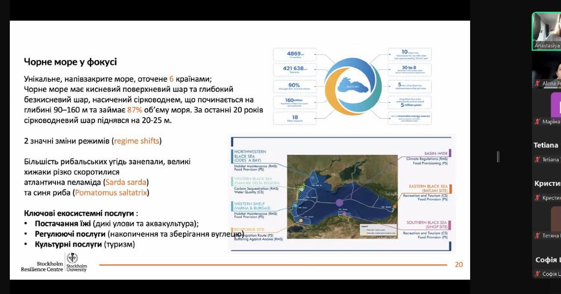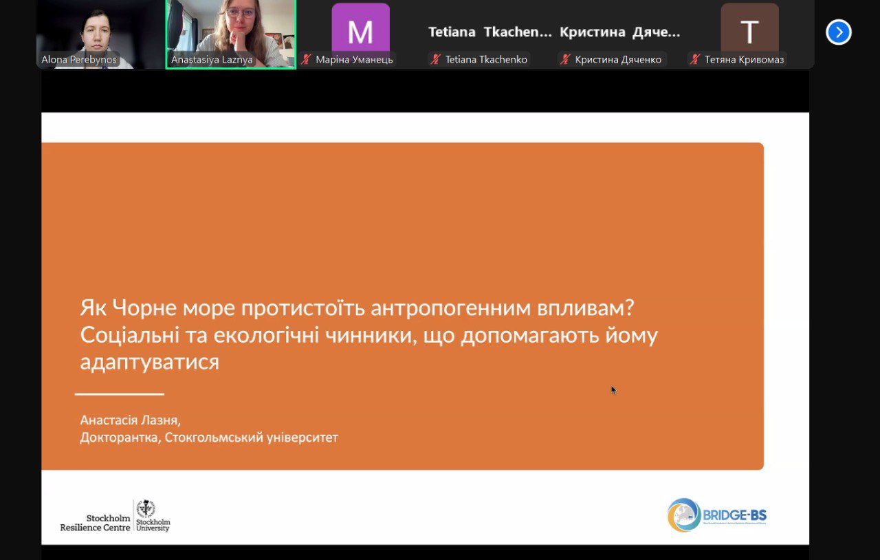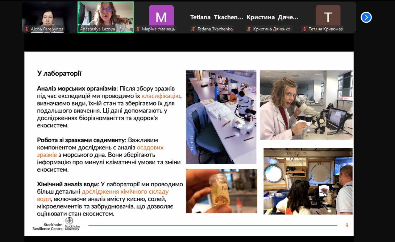 Запрошена спікерка: Анастасія Лазня – аспірантка Stockholm Resilience Centre; випускниця магістерської програми з морських біологічних ресурсів (IMBRSea) у Генті, Бельгія; ступінь бакалавра з екології та охорони навколишнього середовища від Національного університету “Києво-Могилянська академія”.