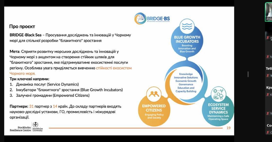 Анастасія Лазня досліджує стійкість екосистем Чорного моря та екосистемні послуги, які вони надають. У рамках проєкту BRIDGE Black Sea проводить ґрунтовний аналіз реакції чорноморських екосистем на численні стресові фактори, включаючи зміни клімату, окислення морської води, забруднення та вплив військових дій. Поєднуючи кількісні та якісні методології, вона має змогу забезпечити точність результатів навіть у випадках браку даних.